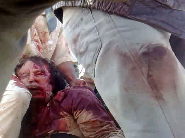 Les informations sur sa capture et sa mort n’ont pas encore été confirmées, faute de preuve. Seule une photo de Kadhafi blessé, prise avec un appareil photo, a été diffusé dans les médias. La chaine nationale a relayé l’annonce faite par un commandant du CNT, Mohamed Leith : « Il est gravement blessé mais il respire encore » , dit-il, en précisant l’avoir vu de ses propres yeux, coiffé d’un turban, un costume kaki sur le dos. Cependant, le site d’une télévision pro-Kadhafi dément «sa capture ou sa mort. »
