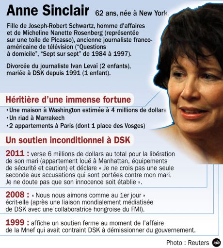 Le sondage, réalisé début décembre auprès d’un échantillon représentatif de 1.005 personnes, ne portait cependant que sur une liste de dix personnalités. Anne Sinclair a été citée par 25% des sondés, Christine Lagarde par 24% et Martine Aubry par 23%. Les femmes placent largement en tête Anne Sinclair (31%) devant Martine Aubry (24%) alors que les hommes ont davantage été marqués par Christine Lagarde (28%), Anne Sinclair n’étant qu’en quatrième position (19%). Pendant l’affaire du Sofitel de New York, lorsque DSK était accusé de tentative de viol, l’ancienne star de la télévision française s’était résolument affichée au côté de son mari, lui offrant son amour et ses moyens financiers pour sa défense.