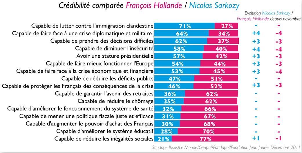 Avec 32% d’intentions de vote au premier tour, François Hollande devance Nicolas Sarkozy à 25,5%, Marine Le Pen en troisième place avec 17%, et un François Bayrou en quatrième homme, avec 7% d’intentions de vote au premier tour. Alors que le candidat socialiste se démarque sur les thèmes sociaux, l’actuel président de la République s’impose lui sur la scène politique internationale.
