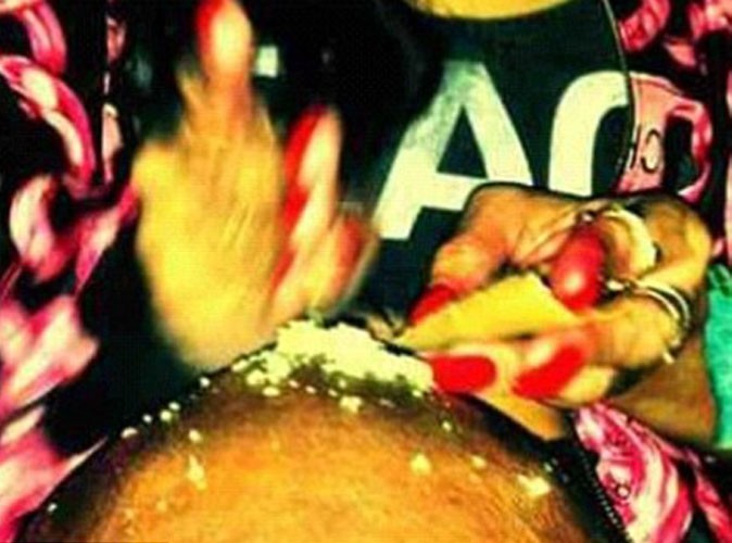 La chanteuse de « umbrella » a publié deux photos, dont une qui a choqué ses fans, on la voit en gros plan déposer sur la tête de l’homme qui la porte, une poudre blanche. Rihanna cocaïnomane? En tout cas, difficile d’imaginer autre chose en découvrant les photos, une provocation de plus ou plutôt de trop cette fois-ci.