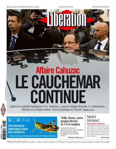 Ce lundi, Libération consacre sa Une au « séisme politique et moral » qui secoue le gouvernement socialiste depuis les aveux de son ministre des Finances, Jérôme Cahuzac, publiés le 2 avril sur son blog : « J’ai rencontré les deux juges aujourd’hui. Je leur ai confirmé l’existence de ce compte (…). J’ai été pris dans une spirale du mensonge et m’y suis fourvoyé. Je suis dévasté par le remord. » Selon le quotidien, « le cauchemar continue » de planer sur l’Elysée… Ou plutôt sur le Quai d’Orsay, dont l’hôte, Laurent Fabius, est soupçonné par Mediapart de posséder un compte dans un paradis fiscal.