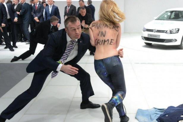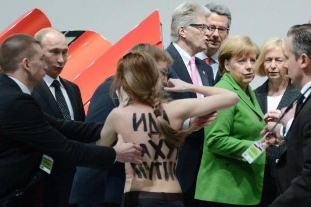 A l’instar de leur chancelière, les Allemands n’ont pas accueilli le chef de l’Etat russe, Vladimir Poutine, les bras ouverts. C’est les seins nus et le dos recouvert d’accroches vindicatives que les Femen sont allées à la rencontre du « dictator ». Et c’est avec des banderoles violemment anti-Poutine que les militants de l’ONG Human Right Watch (HRW) et de la Société pour les peuples menacés lui ont souhaité la « malvenue » dans la ville d’Hanovre.