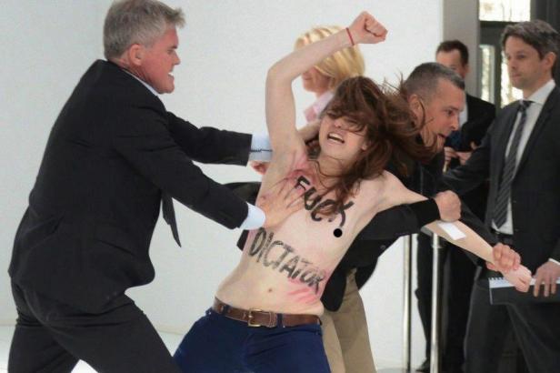 Lundi, l’escale germanique de Vladimir Poutine s’est achevée en beauté ! Les féministes aux seins nus de l’association ukrainienne Femen se sont jetés sur le ploutocrate hurlant « Fuck dictator ! » (Une accroche fleurie que l’on peut traduire par « Va te faire foutre dictateur ») avant d’être stoppées par les personnels de sécurité. Vos impressions M. Poutine ? « Je n’ai pas entendu ce qu’elles avaient crié », a-t-il assuré, ironisant même : « Je n’ai pas vu si elles étaient blondes ou brunes ». Comment ne pas le croire ? Comment le pauvre a-t-il pu identifier la couleur de leurs cheveux alors qu’il avait les yeux rivés sur… Son homologue allemand bien sûr.
