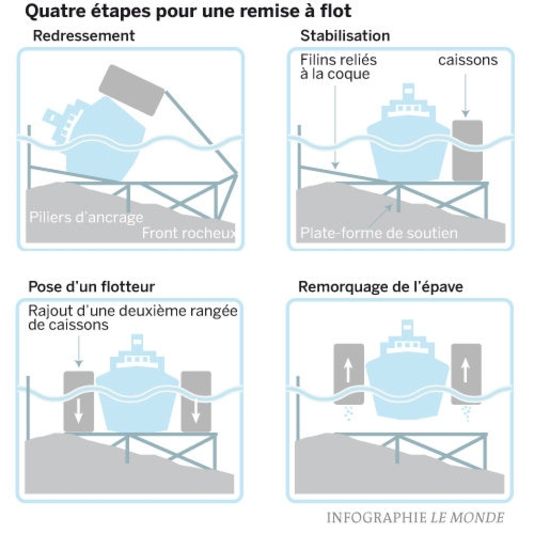 Souvenez-vous, c’était il y a 20 mois. Un bateau de croisière, le Costa Concordia, se renverse avec ses passagers. Pendant deux jours, des experts ont tout fait pour le redresser et c’est chose faite.