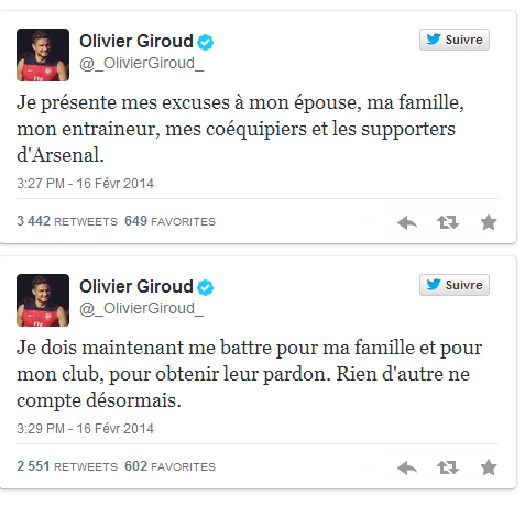 Il a en effet été prit en flagrant délit dans un hôtel Londonnien à 3h 00 du matin avec une escort girl ( Celia Kay), à la veille d’un match important. Au petit matin le quotidien The Sun ne s’est pas gêné pour révéler l’affaire au grand jour, grâce à des photos publiées. Le footballeur a immédiatement réagi en présentant ses excuses via Twitter: » Je présente mes excuses à mon épouse, ma famille, mon entraîneur, mes coéquipiers et les supporters d’Arsenal. Je dois maintenant me battre pour ma famille et pour mon club, pour obtenir leur pardon. Rien d’autre ne compte désormais. ». Les prochains jours risquent d’être difficile à vivre pour Olivier Giroud