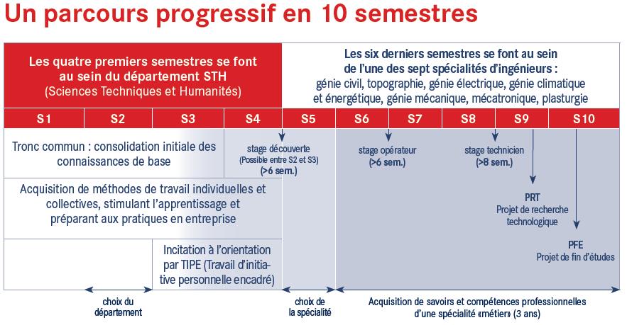 - Sept spécialités d’ingénieurs : génie mécanique, plasturgie, mécatronique, génie civil, topographie, génie climatique et énergétique, génie électrique. Des titulaires de formations courtes ou des techniciens en activité peuvent préparer le diplôme d’ingénieur, en trois ans.